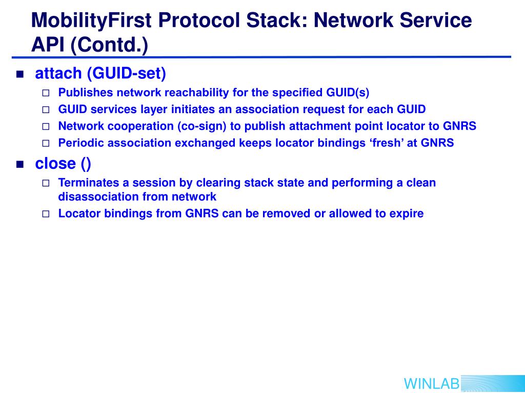 MobilityFirst Protocol Stack: Network Service API (Contd.) • attach (GUID-set) • Publishes network reachability for the specified GUID(s) • GUID services layer initiates an association request for each GUID • Network cooperation (co-sign) to publish attachment point locator to GNRS • Periodic association exchanged keeps locator bindings ‘fresh’ at GNRS • close () • Terminates a session by clearing stack stateand performing a clean disassociation from network • Locator bindings from GNRS can be removed or allowed to expire
