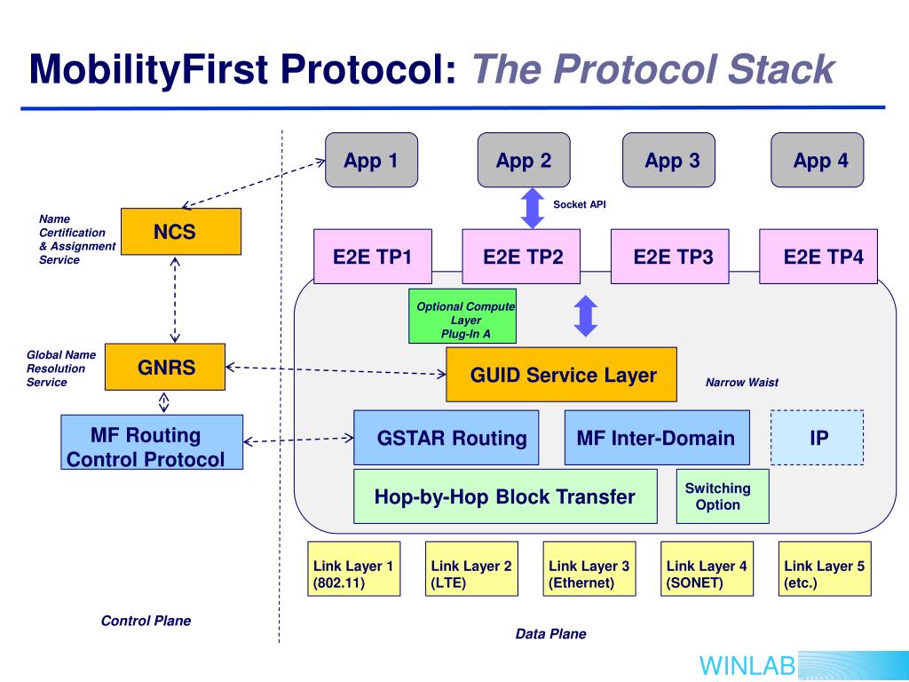 MobilityFirst Protocol: The Protocol Stack App 1 App 2 App 3 App 4 Socket API Name Certification & Assignment Service NCS E2E TP1 E2E TP2 E2E TP3 E2E TP4 Optional Compute Layer Plug-In A Global Name Resolution Service GNRS GUID Service Layer Narrow Waist MF Routing Control Protocol GSTAR Routing MF Inter-Domain IP Switching Option Hop-by-Hop Block Transfer Link Layer 1 (802.11) Link Layer 2 (LTE) Link Layer 3 (Ethernet) Link Layer 4 (SONET) Link Layer 5 (etc.) Control Plane Data Plane