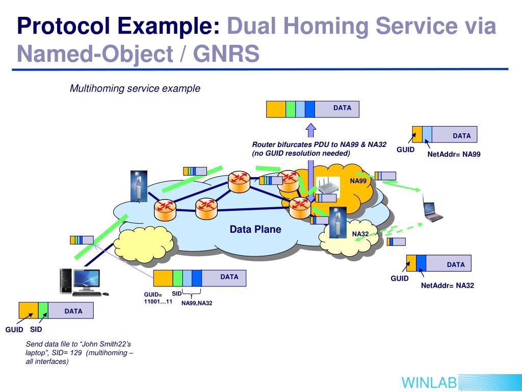 Protocol Example: Dual Homing Service via Named-Object / GNRS Multihoming service example DATA DATA Router bifurcates PDU to NA99 & NA32 (no GUID resolution needed) GUID NetAddr= NA99 NA99 Data Plane NA32 DATA DATA GUID NetAddr= NA32 SID GUID= 11001…11 NA99,NA32 DATA SID GUID Send data file to “John Smith22’s laptop”, SID= 129 (multihoming– all interfaces)