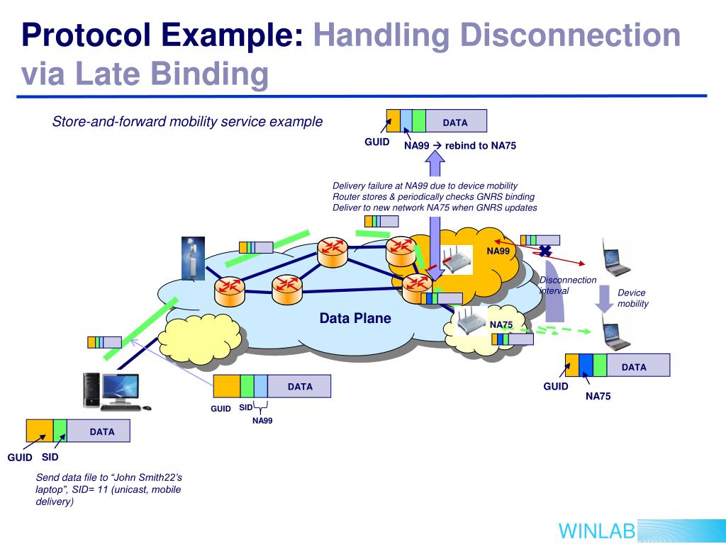 Protocol Example: Handling Disconnection via Late Binding Store-and-forward mobility service example DATA GUID NA99 rebind to NA75 Delivery failure at NA99 due to device mobility Router stores & periodically checks GNRS binding Deliver to new network NA75 when GNRS updates NA99 Disconnection interval Device mobility Data Plane NA75 DATA GUID DATA NA75 SID GUID NA99 DATA SID GUID Send data file to “John Smith22’s laptop”, SID= 11 (unicast, mobile delivery)
