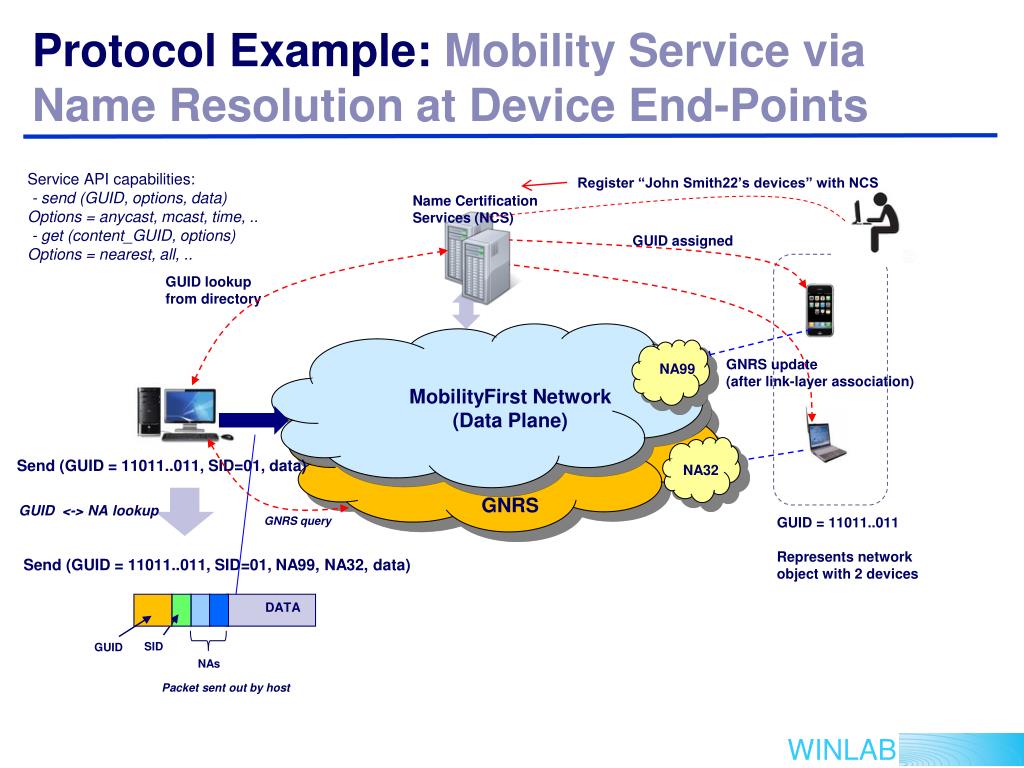 Protocol Example: Mobility Service via Name Resolution at Device End-Points Service API capabilities: - send (GUID, options, data) Options = anycast, mcast, time, .. - get (content_GUID, options) Options = nearest, all, .. Register “John Smith22’s devices” with NCS Name Certification Services (NCS) GUID assigned GUID lookup from directory GNRS update (after link-layer association) NA99 MobilityFirst Network (Data Plane) Send (GUID = 11011..011, SID=01, data) NA32 GNRS GUID <-> NA lookup GUID = 11011..011 Represents network object with 2 devices GNRS query Send (GUID = 11011..011, SID=01, NA99, NA32, data) DATA SID GUID NAs Packet sent out by host