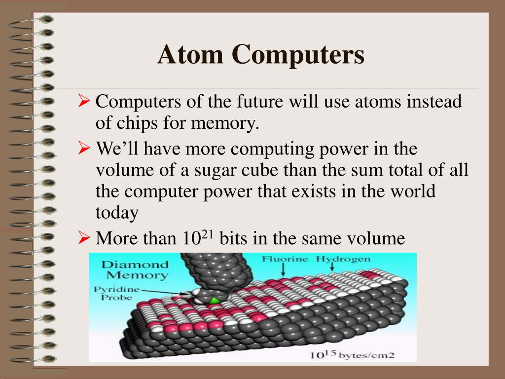 Atom Computers • Computers of the future will use atoms instead of chips for memory. • We’ll have more computing power in the volume of a sugar cube than the sum total of all the computer power that exists in the world today • More than 1021 bits in the same volume
