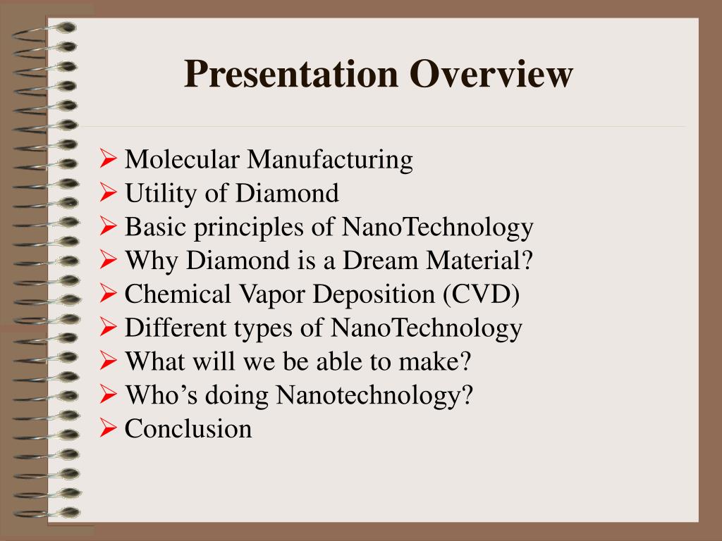 Presentation Overview • Molecular Manufacturing • Utility of Diamond • Basic principles of NanoTechnology • Why Diamond is a Dream Material? • Chemical Vapor Deposition (CVD) • Different types of NanoTechnology • What will we be able to make? • Who’s doing Nanotechnology? • Conclusion