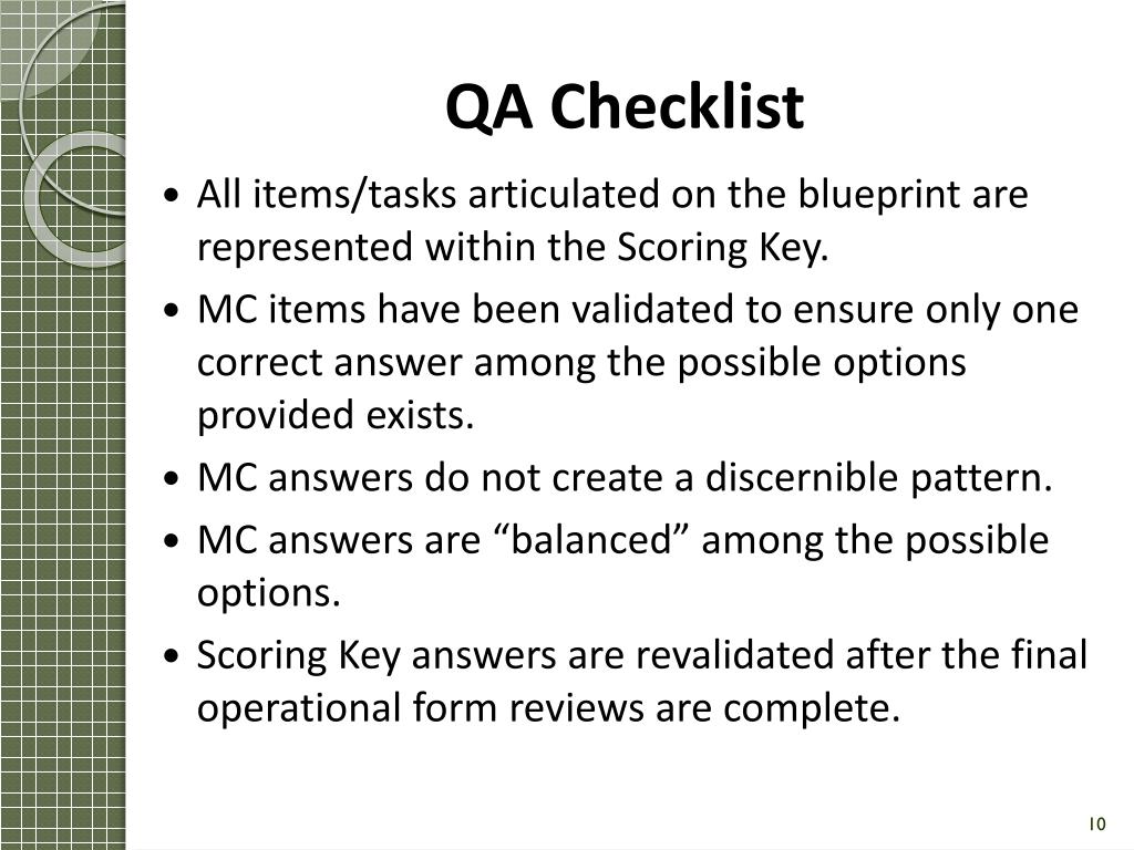 QA Checklist • All items/tasks articulated on the blueprint are represented within the Scoring Key. • MC items have been validated to ensure only one correct answer among the possible options provided exists. • MC answers do not create a discernible pattern. • MC answers are “balanced” among the possible options. • Scoring Key answers are revalidated after the final operational form reviews are complete.