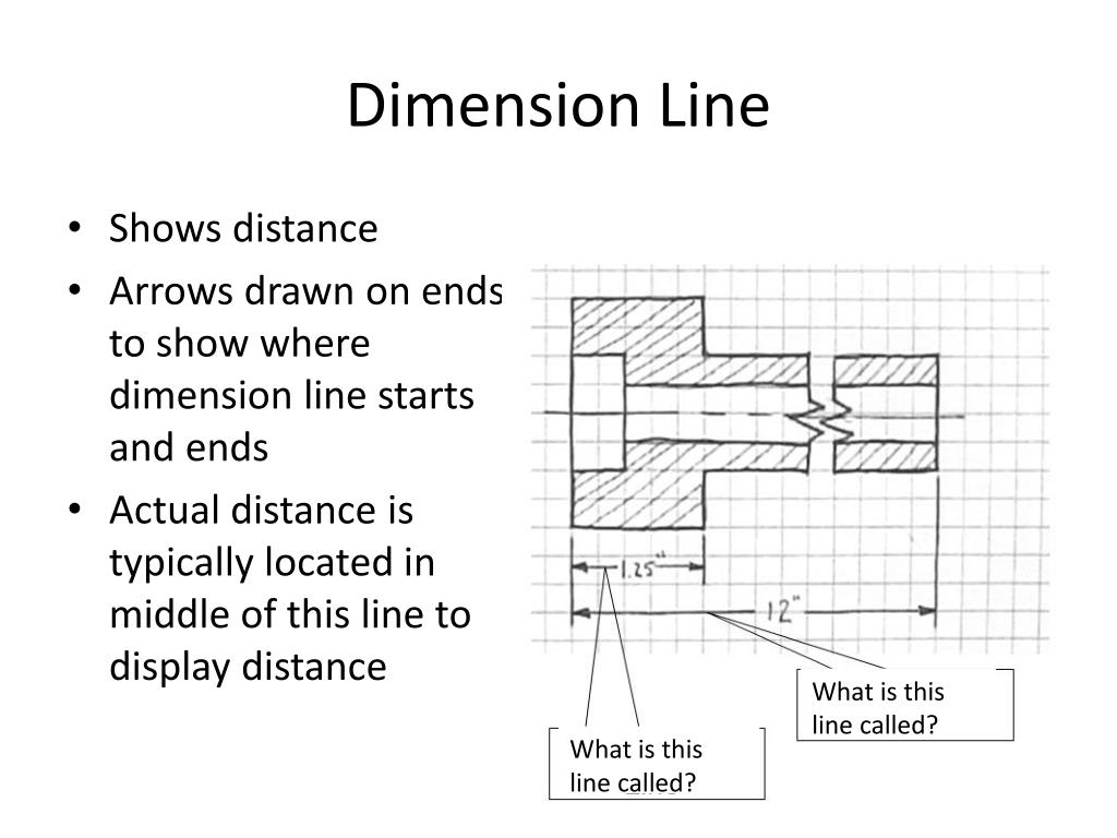 Dimension Line • Shows distance • Arrows drawn on ends to show where dimension line starts and ends • Actual distance is typically located in middle of this line to display distance What is this line called? What is this line called?