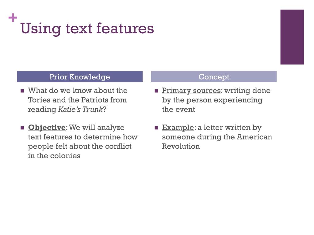 Using text features Prior Knowledge Concept • What do we know about the Tories and the Patriots from reading Katie’s Trunk? • Objective: We will analyze text features to determine how people felt about the conflict in the colonies • Primary sources: writing done by the person experiencing the event • Example: a letter written by someone during the American Revolution