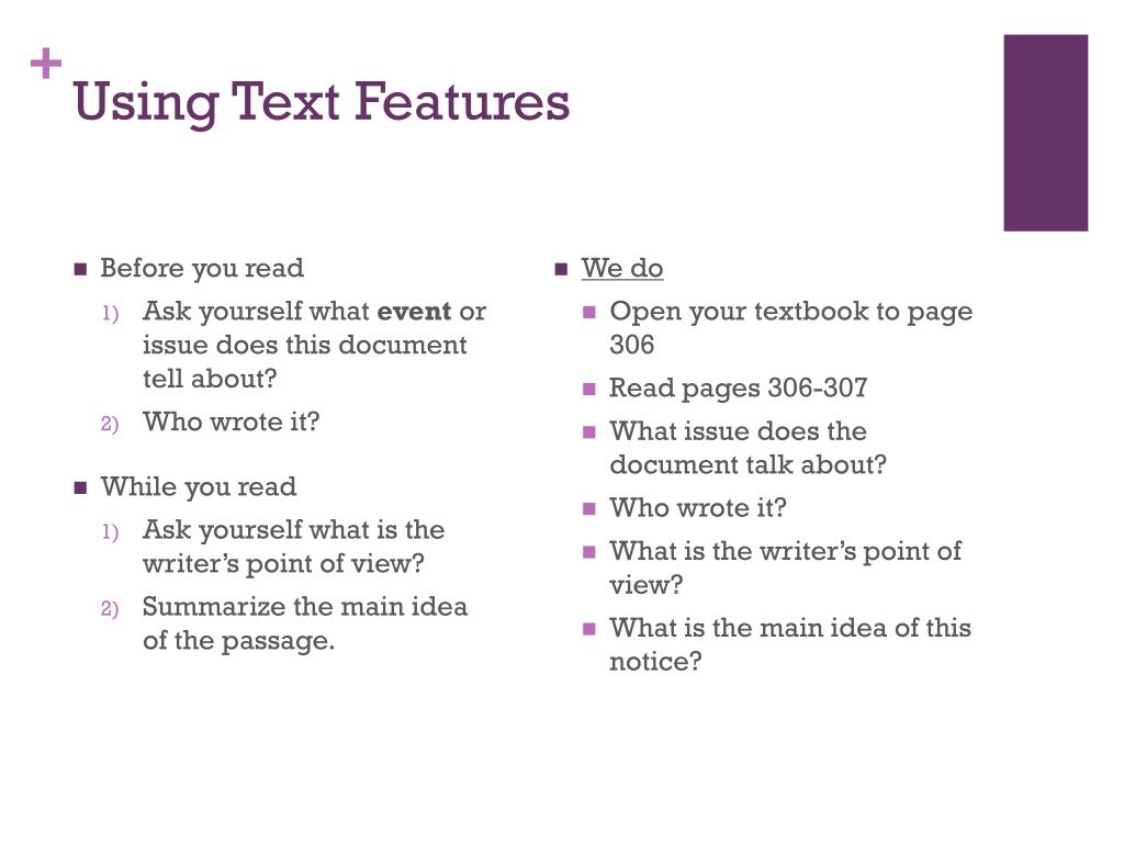 Using Text Features • We do • Open your textbook to page 306 • Read pages 306-307 • What issue does the document talk about? • Who wrote it? • What is the writer’s point of view? • What is the main idea of this notice? • Before you read • Ask yourself what event or issue does this document tell about? • Who wrote it? • While you read • Ask yourself what is the writer’s point of view? • Summarize the main idea of the passage.