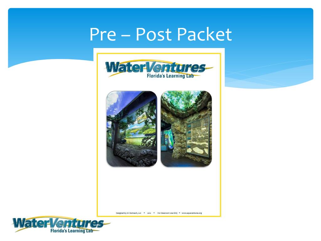Agenda for the day • Welcome and Background Information on WaterVentures • Split Group • Group 1: (Truck) Student experience preview of the vehicle • Group 2: (Media Center) Provide background information for topics covered within the vehicle and review supplementary materials • Review Pre/Post Packet, Trip Tips, and Questions