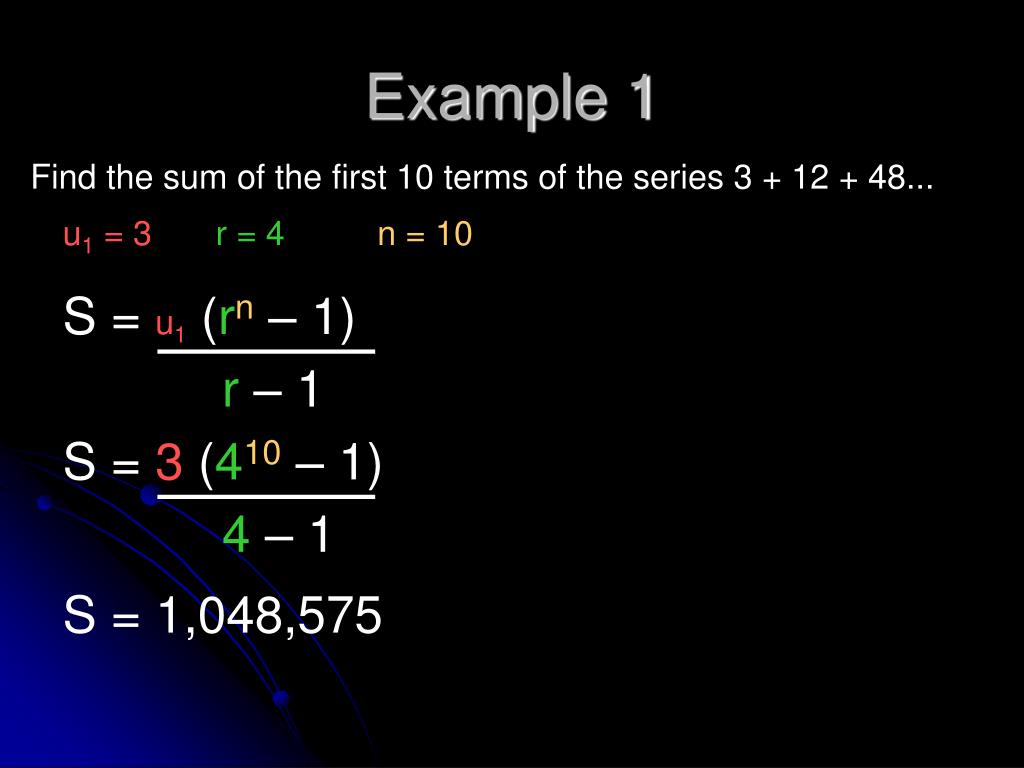 S = u1 (rn – 1) S = 3 (410 – 1) r – 1 4 – 1 Example 1 Find the sum of the first 10 terms of the series 3 + 12 + 48... u1 = 3 r = 4 n = 10 S = 1,048,575