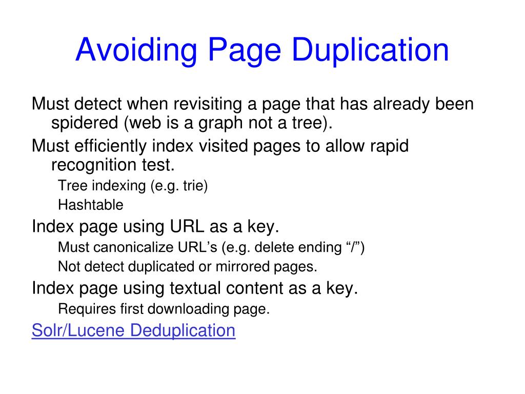 Avoiding Page Duplication • Must detect when revisiting a page that has already been spidered (web is a graph not a tree). • Must efficiently index visited pages to allow rapid recognition test. • Tree indexing (e.g. trie) • Hashtable • Index page using URL as a key. • Must canonicalize URL’s (e.g. delete ending “/”) • Not detect duplicated or mirrored pages. • Index page using textual content as a key. • Requires first downloading page. • Solr/Lucene Deduplication