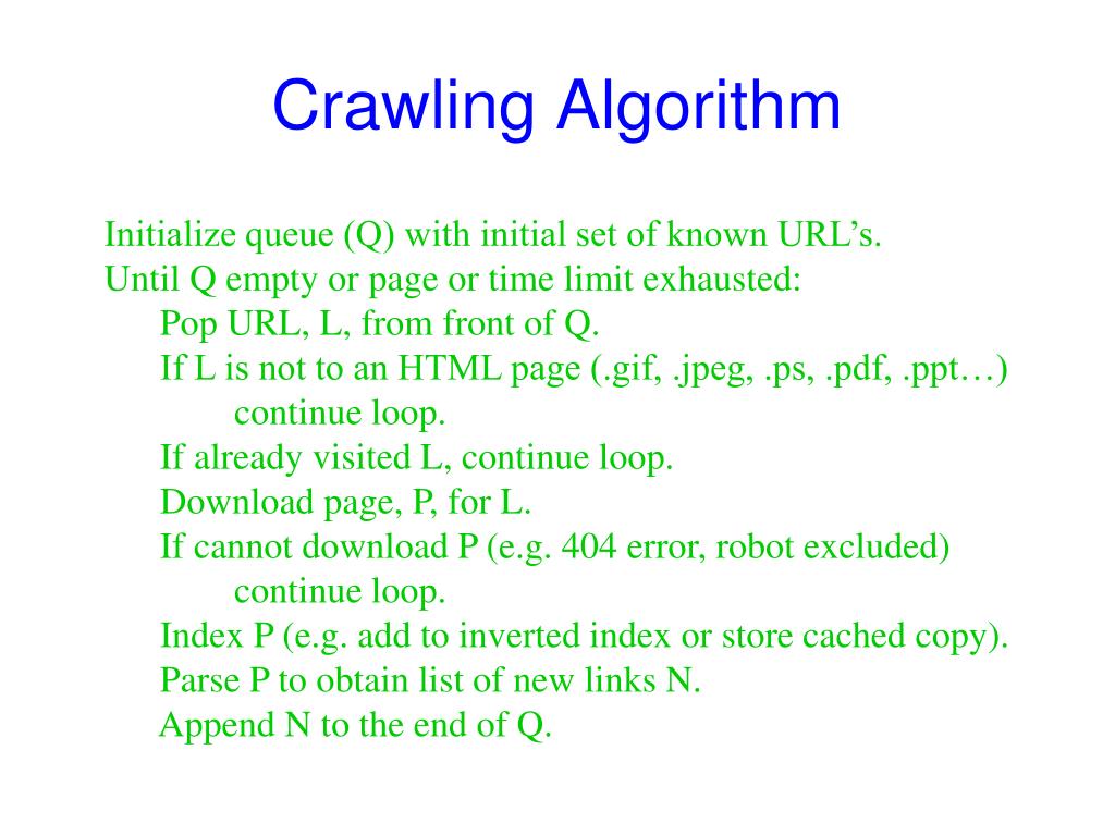 Crawling Algorithm Initialize queue (Q) with initial set of known URL’s. Until Q empty or page or time limit exhausted: Pop URL, L, from front of Q. If L is not to an HTML page (.gif, .jpeg, .ps, .pdf, .ppt…) continue loop. If already visited L, continue loop. Download page, P, for L. If cannot download P (e.g. 404 error, robot excluded) continue loop. Index P (e.g. add to inverted index or store cached copy). Parse P to obtain list of new links N. Append N to the end of Q.