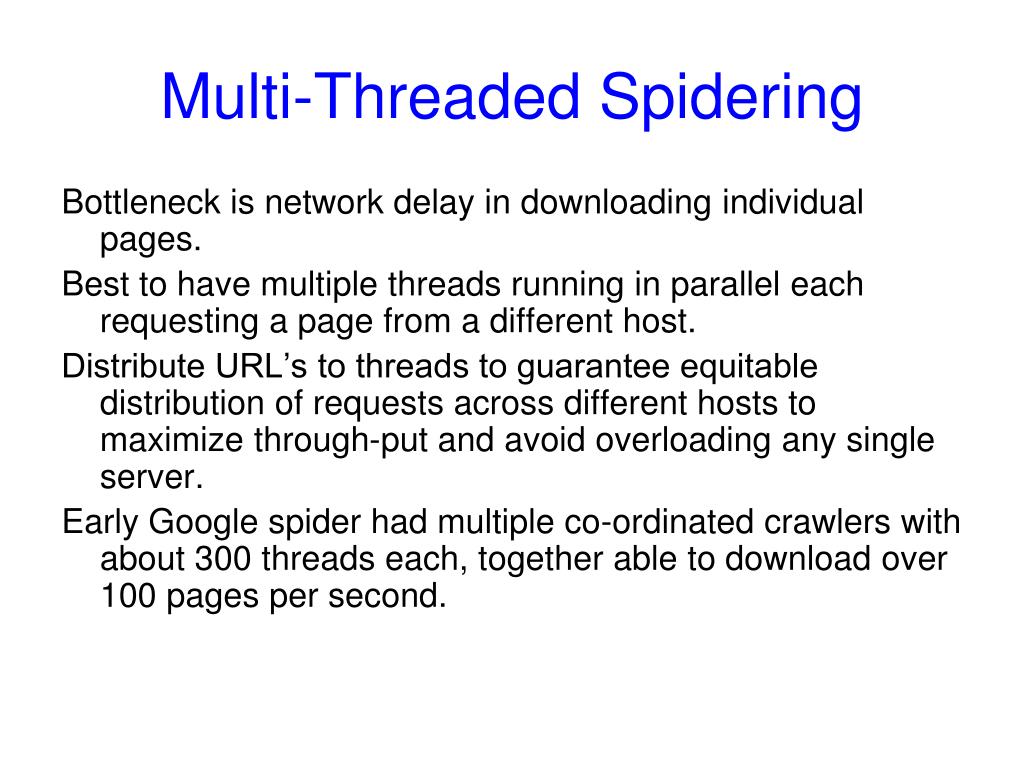 Multi-Threaded Spidering • Bottleneck is network delay in downloading individual pages. • Best to have multiple threads running in parallel each requesting a page from a different host. • Distribute URL’s to threads to guarantee equitable distribution of requests across different hosts to maximize through-put and avoid overloading any single server. • Early Google spider had multiple co-ordinated crawlers with about 300 threads each, together able to download over 100 pages per second.