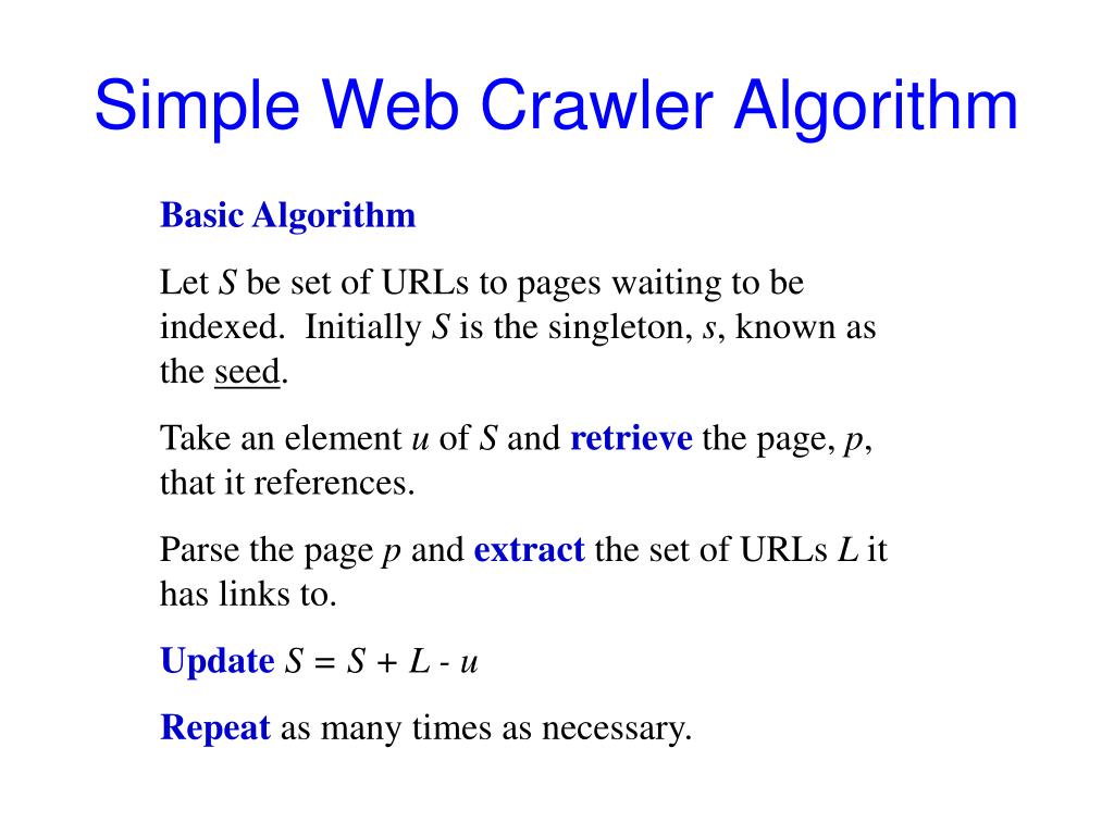 Simple Web Crawler Algorithm Basic Algorithm Let S be set of URLs to pages waiting to be indexed. Initially S is the singleton, s, known as the seed. Take an element u of S and retrieve the page, p, that it references. Parse the page p and extract the set of URLs L it has links to. UpdateS = S + L - u Repeat as many times as necessary.