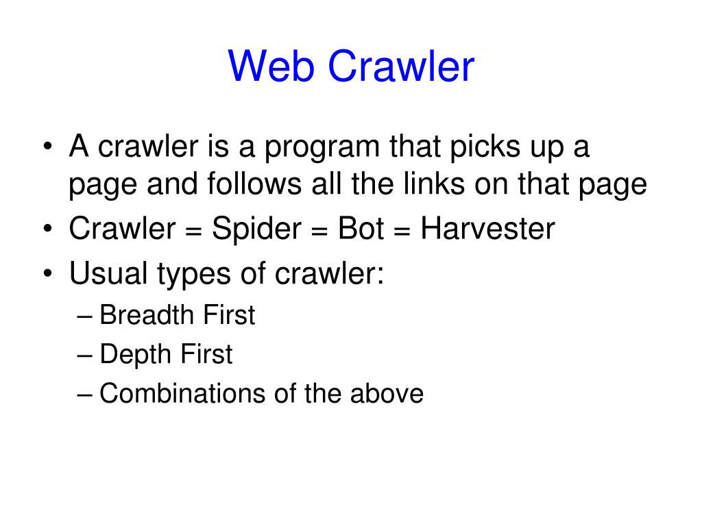 Web Crawler • A crawler is a program that picks up a page and follows all the links on that page • Crawler = Spider = Bot = Harvester • Usual types of crawler: • Breadth First • Depth First • Combinations of the above