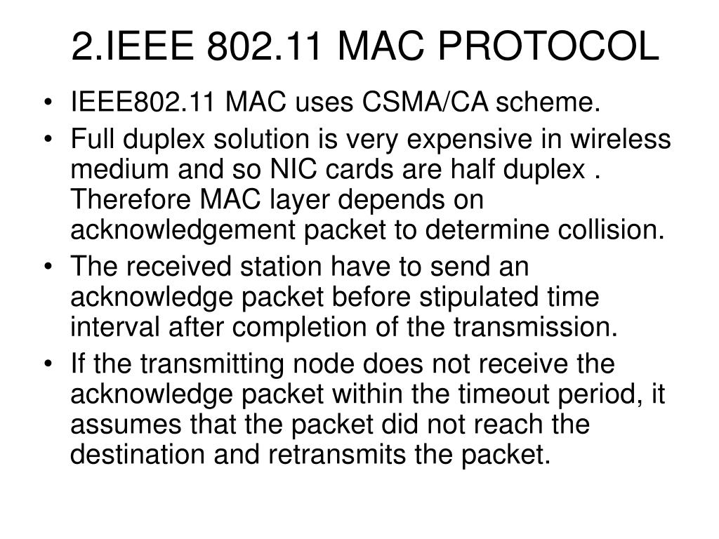 2.IEEE 802.11 MAC PROTOCOL • IEEE802.11 MAC uses CSMA/CA scheme. • Full duplex solution is very expensive in wireless medium and so NIC cards are half duplex . Therefore MAC layer depends on acknowledgement packet to determine collision. • The received station have to send an acknowledge packet before stipulated time interval after completion of the transmission. • If the transmitting node does not receive the acknowledge packet within the timeout period, it assumes that the packet did not reach the destination and retransmits the packet.