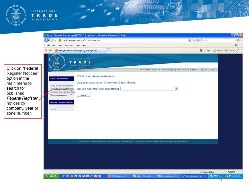 Online FTZ Information System (OFIS) • Now available at www.trade.gov/ftz • All zone sites, Federal Register notices and other information available in one location (including maps and sunset dates for sites) • No log in needed for zone and site information • Grantees can track and update the status of their sites, update contact information and request operator accounts