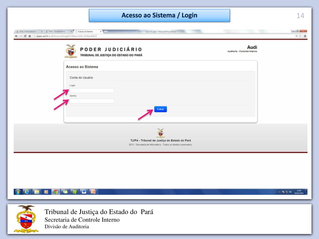 Repositório • O que é o Repositório de Auditoria? • Recurso de armazenamento organizado de documentos que contém todos os Papéis de Trabalho e demais documentos da auditoria. • Para que serve: • Consultar documentos das auditorias passadas (eletronicamente); • Usar recursos (Papéis de Trabalho) de auditorias anteriores nas atuais (eletronicamente); • Permitir a comunicação eletrônica automática entre sistemas;- Ex: Integração AUDI x SIGADOC (sistema de processo eletrônico do TJPA).