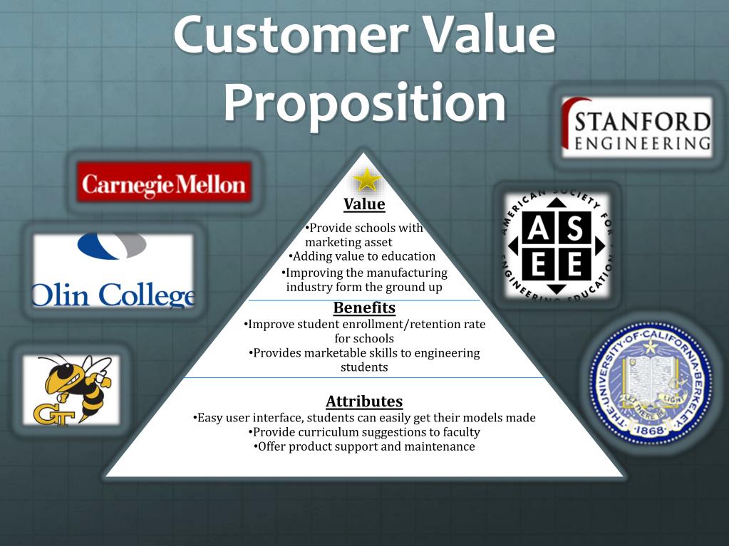 Customer Value Proposition Value • Provide schools with marketing asset • Adding value to education • Improving the manufacturing industry form the ground up • Benefits • Improve student enrollment/retention rate for schools • Provides marketable skills to engineering students • Attributes • Easy user interface, students can easily get their models made • Provide curriculum suggestions to faculty • Offer product support and maintenance