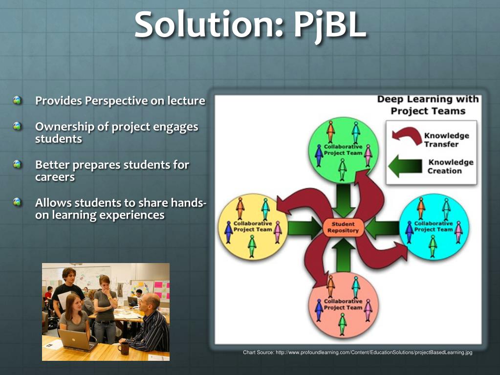 Solution: PjBL • Provides Perspective on lecture • Ownership of project engages students • Better prepares students for careers • Allows students to share hands-on learning experiences Chart Source: http://www.profoundlearning.com/Content/EducationSolutions/projectBasedLearning.jpg