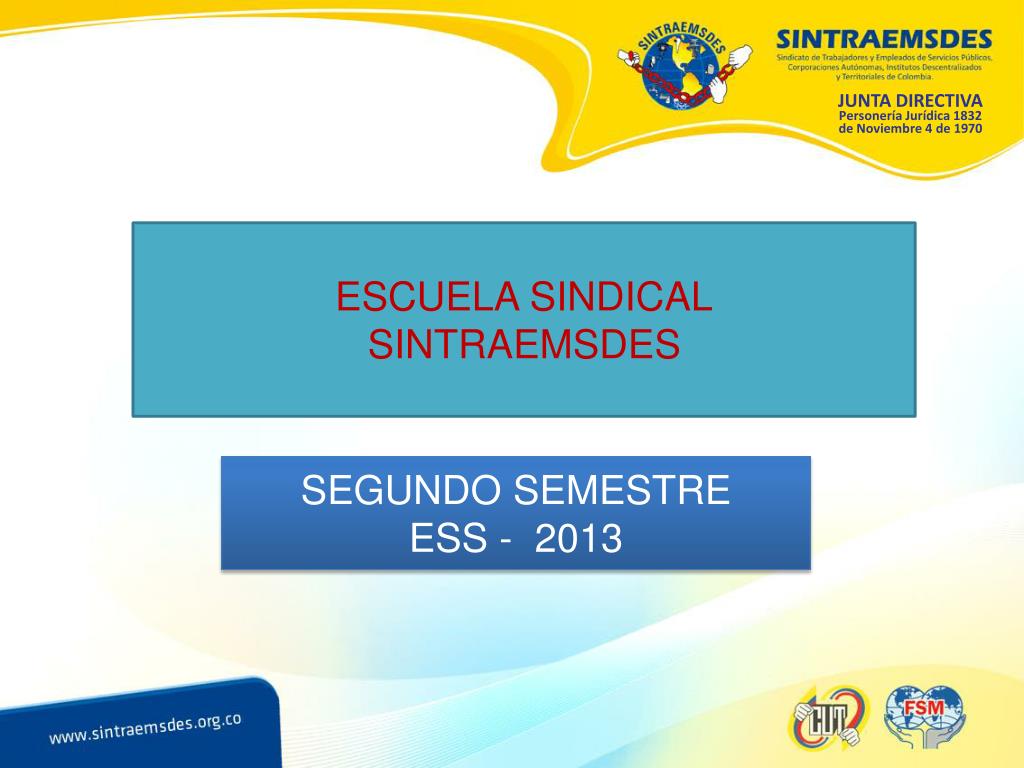 ESCUELA SINDICAL SINTRAEMSDES – ESS - 2013 JUNTA DIRECTIVA Personería Jurídica 1832 de Noviembre 4 de 1970 SECRETARÍA DE EDUCACIÓN Y BIENESTAR SOCIAL SINTRAEMSDES NACIONAL PRIMER SEMESTRE 2013