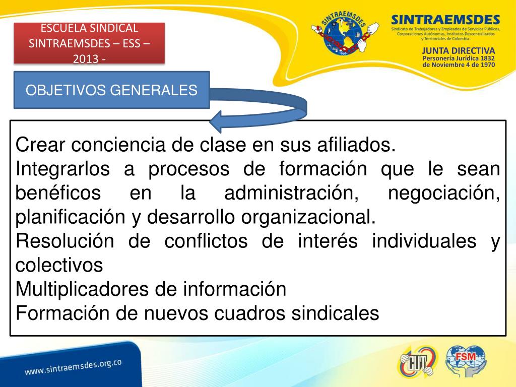 ESCUELA SINDICAL SINTRAEMSDES – ESS – 2013 - JUNTA DIRECTIVA Personería Jurídica 1832 de Noviembre 4 de 1970 OBJETIVOS GENERALES • Crear conciencia de clase en sus afiliados. • Integrarlos a procesos de formación que le sean benéficos en la administración, negociación, planificación y desarrollo organizacional. • Resolución de conflictos de interés individuales y colectivos • Multiplicadores de información • Formación de nuevos cuadros sindicales