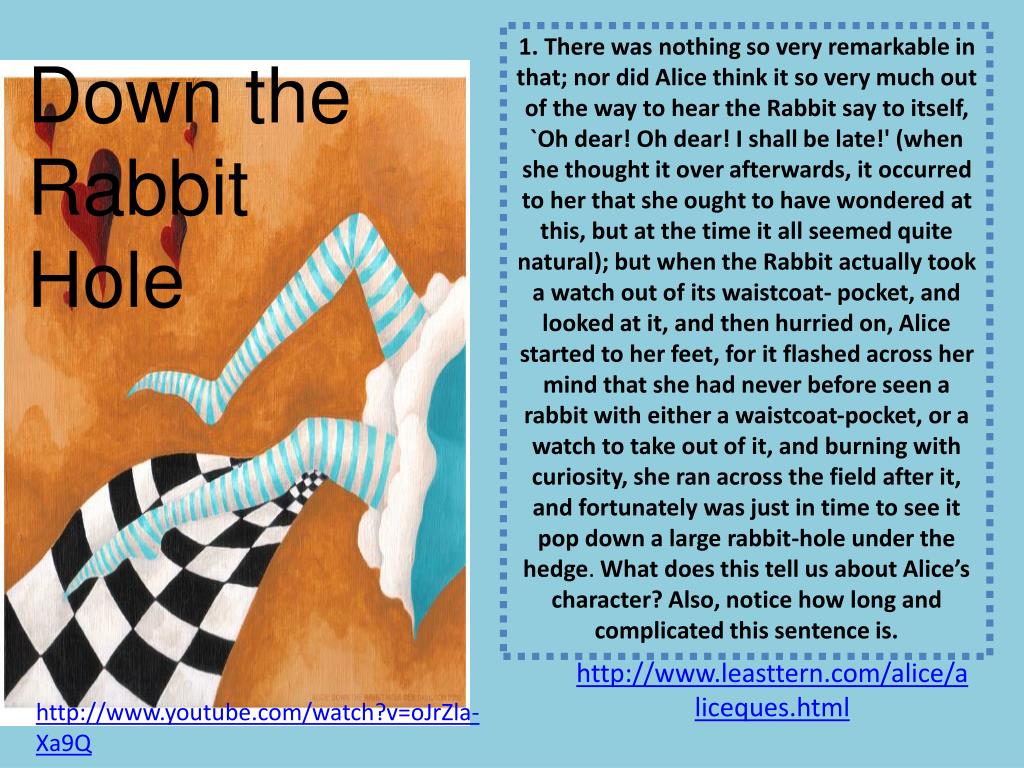 1. There was nothing so very remarkable in that; nor did Alice think it so very much out of the way to hear the Rabbit say to itself, `Oh dear! Oh dear! I shall be late!' (when she thought it over afterwards, it occurred to her that she ought to have wondered at this, but at the time it all seemed quite natural); but when the Rabbit actually took a watch out of its waistcoat- pocket, and looked at it, and then hurried on, Alice started to her feet, for it flashed across her mind that she had never before seen a rabbit with either a waistcoat-pocket, or a watch to take out of it, and burning with curiosity, she ran across the field after it, and fortunately was just in time to see it pop down a large rabbit-hole under the hedge. What does this tell us about Alice’s character? Also, notice how long and complicated this sentence is. http://www.leasttern.com/alice/aliceques.html Down the Rabbit Hole http://www.youtube.com/watch?v=oJrZla-Xa9Q