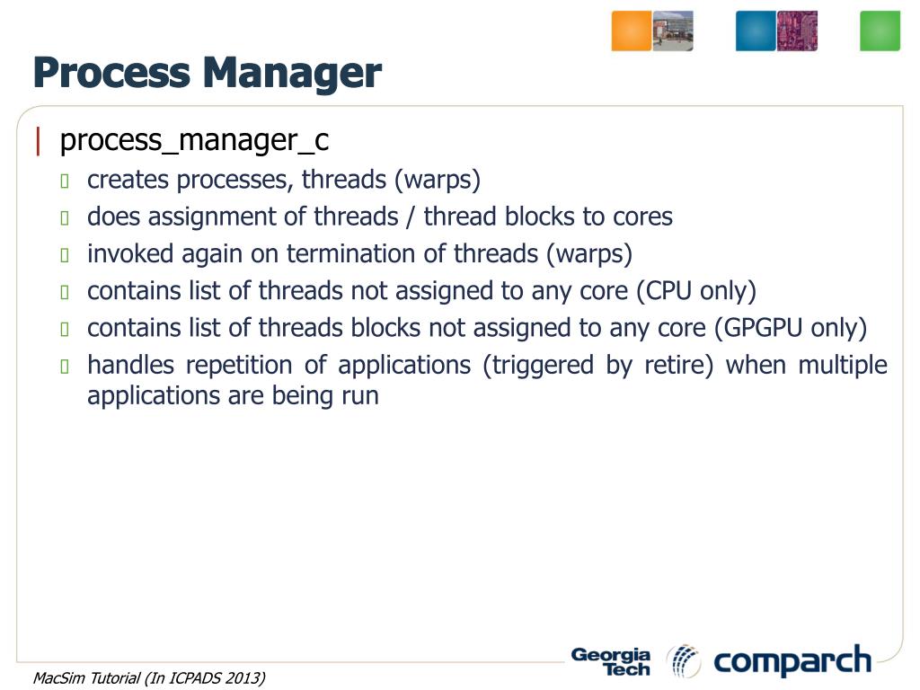 Process Manager • process_manager.cc • Defines member functions of process_manager_c class MacSim Tutorial (In ICPADS 2013)