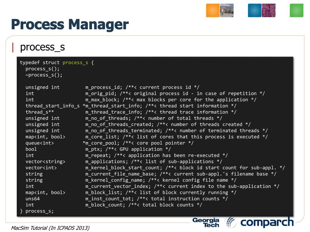 Process Manager typedefstructprocess_s{ process_s(); ~process_s(); unsigned intm_process_id; /**< current process id */ intm_orig_pid; /**< original process id - in case of repetition */ intm_max_block; /**< max blocks per core for the application */ thread_start_info_s *m_thread_start_info; /**< thread start information */ thread_s** m_thread_trace_info; /**< thread trace information */ unsigned intm_no_of_threads; /**< number of total threads */ unsigned intm_no_of_threads_created; /**< number of threads created */ unsigned intm_no_of_threads_terminated; /**< number of terminated threads */ map<int, bool> m_core_list; /**< list of cores that this process is executed */ queue<int> *m_core_pool; /**< core pool pointer */ boolm_ptx; /**< GPU application */ intm_repeat; /**< application has been re-executed */ vector<string> m_applications; /**< list of sub-applications */ vector<int> m_kernel_block_start_count; /**< block id start count for sub-appl. */ string m_current_file_name_base; /**< current sub-appl.'s filename base */ string m_kernel_config_name; /**< kernel config file name */ intm_current_vector_index; /**< current index to the sub-application */ map<int, bool> m_block_list; /**< list of block currently running */ uns64 m_inst_count_tot; /**< total instruction counts */ intm_block_count; /**< total block counts */ } process_s; process_s MacSim Tutorial (In ICPADS 2013)