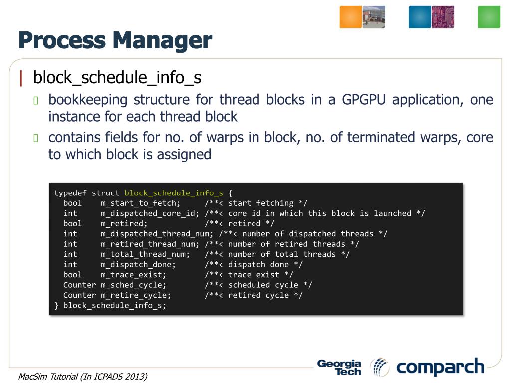 Process Manager typedefstructblock_schedule_info_s{ boolm_start_to_fetch; /**< start fetching */ intm_dispatched_core_id; /**< core id in which this block is launched */ boolm_retired; /**< retired */ intm_dispatched_thread_num; /**< number of dispatched threads */ intm_retired_thread_num; /**< number of retired threads */ intm_total_thread_num; /**< number of total threads */ intm_dispatch_done; /**< dispatch done */ boolm_trace_exist; /**< trace exist */ Counter m_sched_cycle; /**< scheduled cycle */ Counter m_retire_cycle; /**< retired cycle */ } block_schedule_info_s; • block_schedule_info_s • bookkeeping structure for thread blocks in a GPGPU application, one instance for each thread block • contains fields for no. of warps in block, no. of terminated warps, core to which block is assigned MacSim Tutorial (In ICPADS 2013)