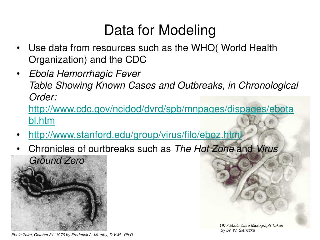 Data for Modeling • Use data from resources such as the WHO( World Health Organization) and the CDC • Ebola Hemorrhagic FeverTable Showing Known Cases and Outbreaks, in Chronological Order: http://www.cdc.gov/ncidod/dvrd/spb/mnpages/dispages/ebotabl.htm • http://www.stanford.edu/group/virus/filo/eboz.html • Chronicles of ourtbreaks such as The Hot Zone and Virus Ground Zero 1977 Ebola Zaire Micrograph Taken By Dr. W. Slenczka Ebola Zaire, October 31, 1976 by Frederick A. Murphy, D.V.M., Ph.D