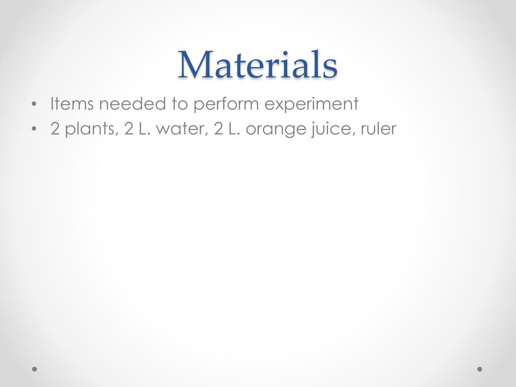 Materials • Items needed to perform experiment • 2 plants, 2 L. water, 2 L. orange juice, ruler