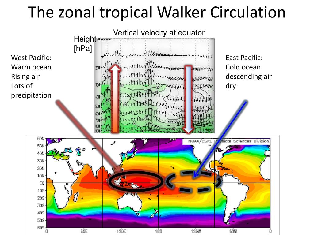 The zonal tropical Walker Circulation Westward (easterly) surface trade winds on the equator Low sea level pressure in western Pacific, High sea level pressure in eastern Pacific Walker