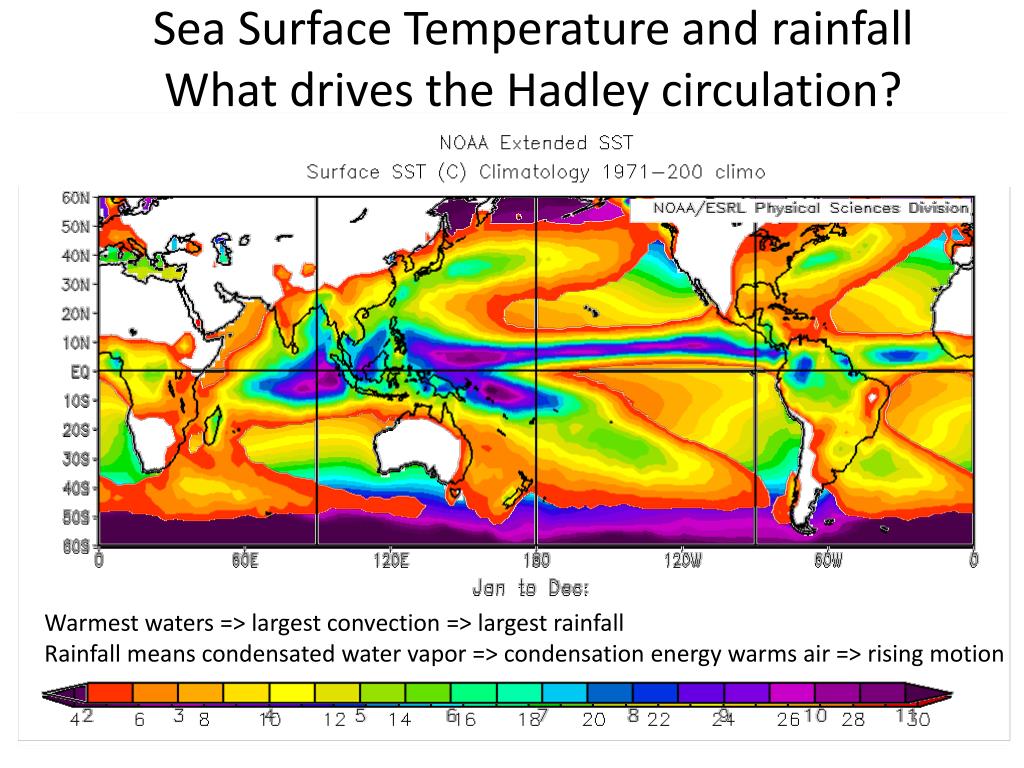 Sea Surface Temperature and rainfall What drives the Hadley circulation? Warmest waters => largest convection => largest rainfall Rainfall means condensated water vapor => condensation energy warms air => rising motion