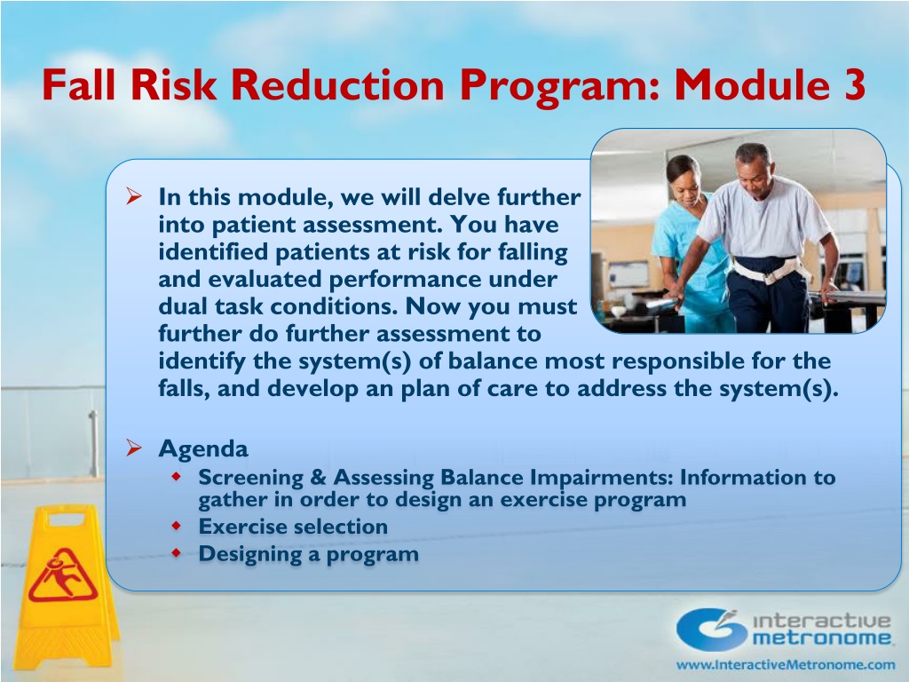 Fall Risk Reduction Program Exercises • This library of exercises are suggestions. Concept is to design exercises, using the Interactive Metronome that target specific problem areas • Center treatment interventions around long and short term goals that are important to the patient. Goal selection was discussed in the second module • Download can be found on course materials page