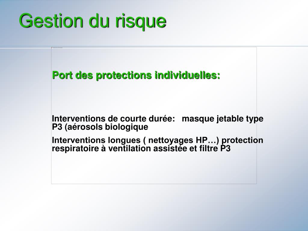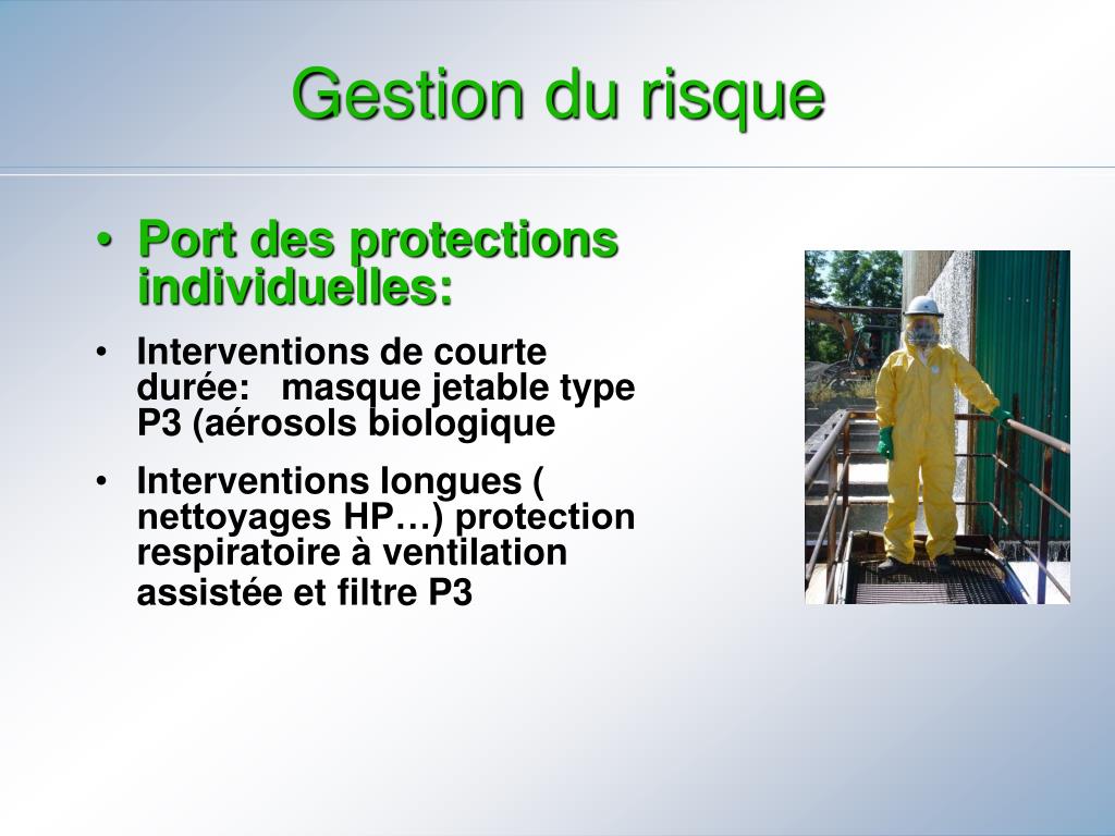 Gestion du risque • Port des protections individuelles: • Interventions de courte durée: masque jetable type P3 (aérosols biologique • Interventions longues ( nettoyages HP…) protection respiratoire à ventilation assistée et filtre P3