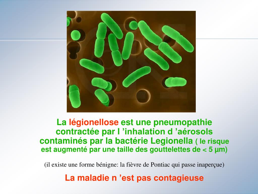La légionellose est une pneumopathie contractée par l ’inhalation d ’aérosols contaminés par la bactérie Legionella ( le risque est augmenté par une taille des gouttelettes de < 5 µm) (il existe une forme bénigne: la fièvre de Pontiac qui passe inaperçue) La maladie n ’est pas contagieuse