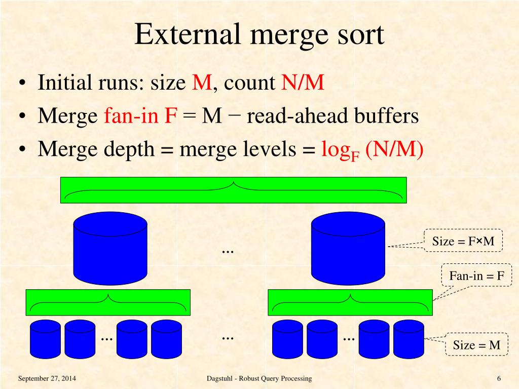 External merge sort • Initial runs: size M, count N/M • Merge fan-in F= M − read-ahead buffers • Merge depth = merge levels = logF (N/M) Size = F×M … Fan-in = F … … … Size = M Dagstuhl - Robust Query Processing