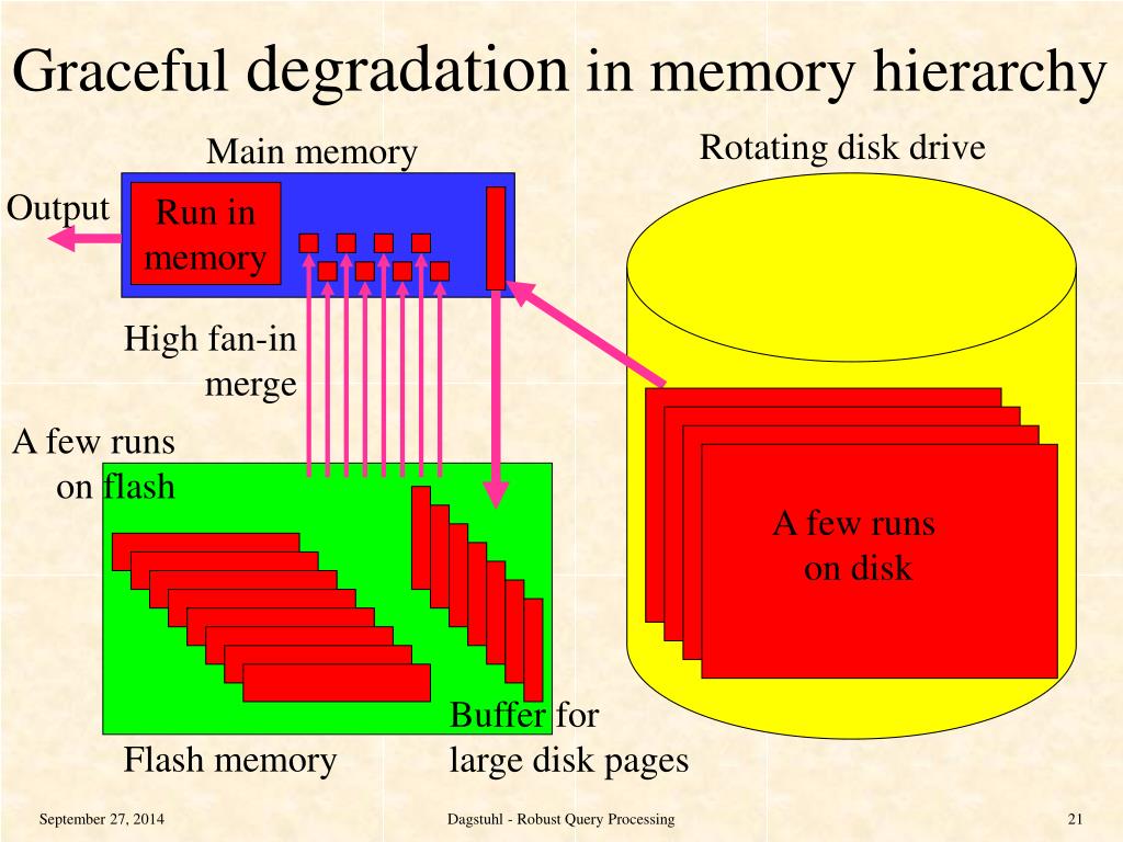 Graceful degradation in memory hierarchy Rotating disk drive Main memory Output Run inmemory High fan-in merge A few runs on flash A few runs on disk Buffer for large disk pages Flash memory Dagstuhl - Robust Query Processing