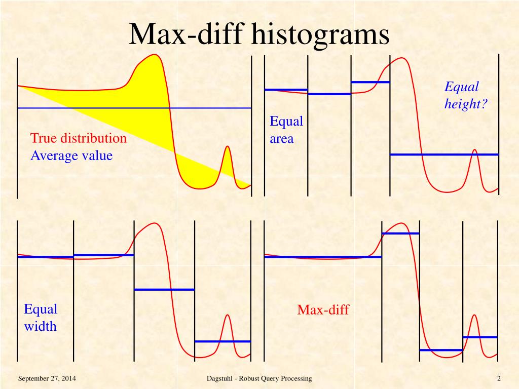 Robust query processing. Goetz Graefe, Christian König, Harumi Kuno, Volker Markl, Kai-Uwe Sattler Dagstuhl – September 2010. Max-diff histograms. Equal height?. Equal area. True distribution Average value. Equal width. Max-diff. Histograms with slope. True distribution Average value.