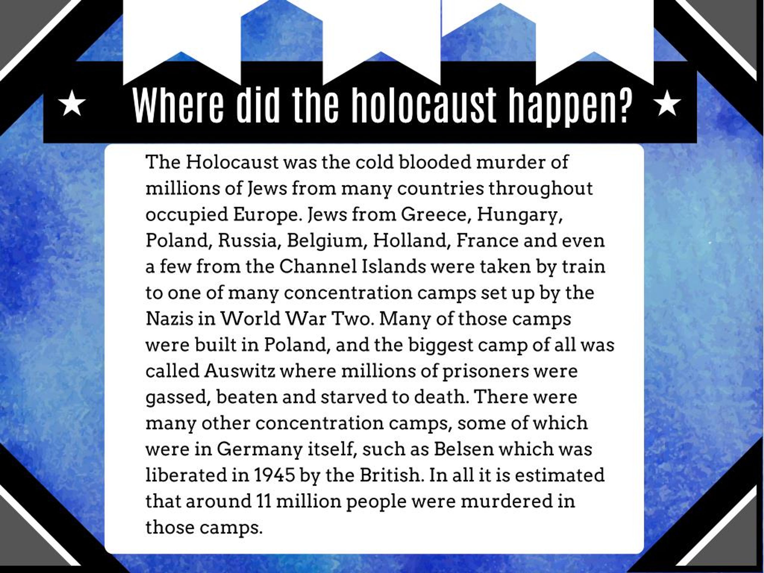 Where did the holocaust happen? Where did the holocaust happen? The Holocaust was the cold blooded murder of millions of Jews from many countries throughout occupied Europe. Jews from Greece, Hungary, Poland, Russia, Belgium, Holland, France and even a few from the Channel Islands were taken by train to one of many concentration camps set up by the Nazis in World War Two. Many of those camps were built in Poland, and the biggest camp of all was called Auswitz where millions of prisoners were gassed, beaten and starved to death. There were many other concentration camps, some of which were in Germany itself, such as Belsen which was liberated in 1945 by the British. In all it is estimated that around 11 million people were murdered in those camps.