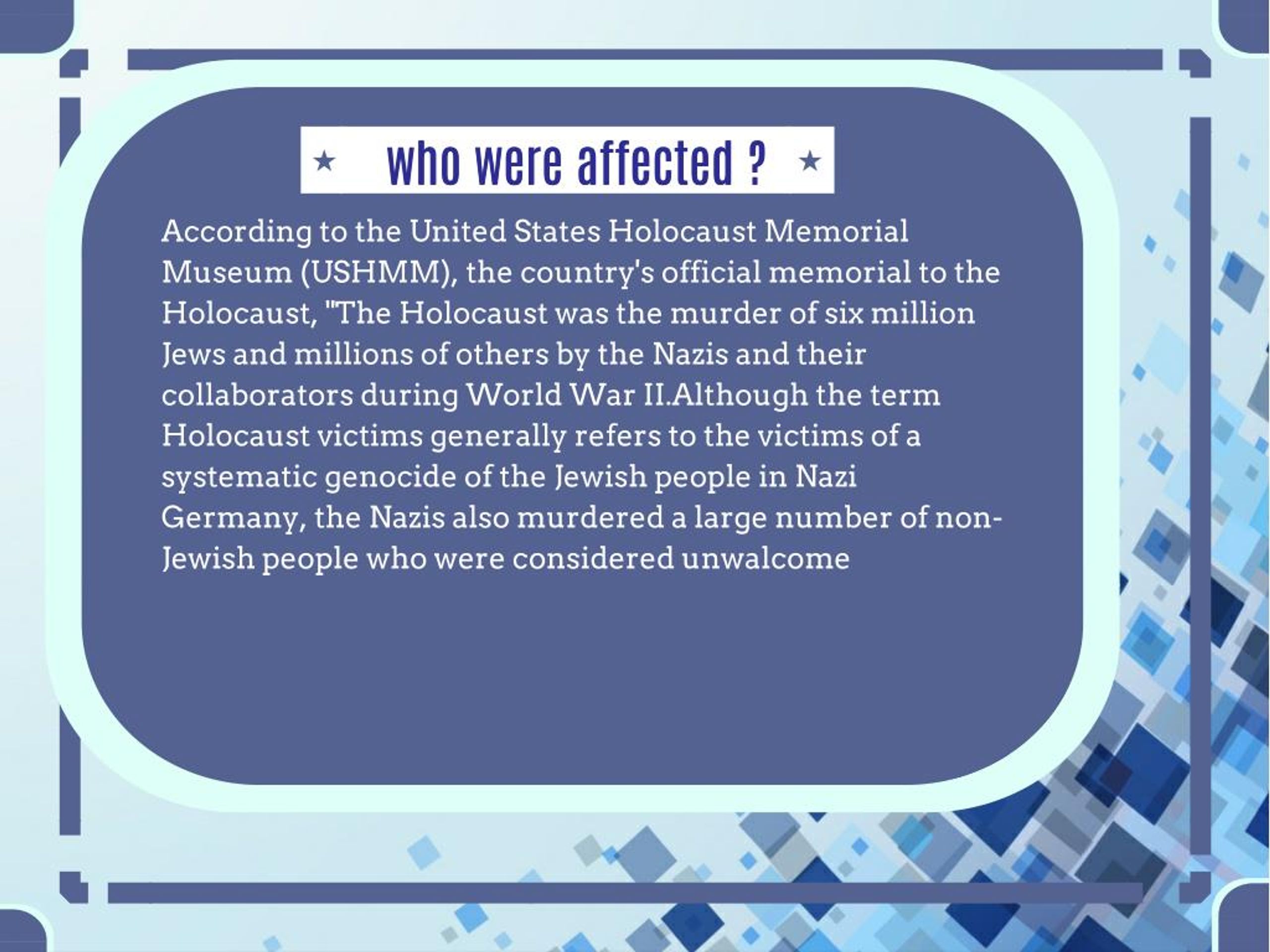 who were affected ? who were affected ? According to the United States Holocaust Memorial Museum (USHMM), the country's official memorial to the Holocaust, "The Holocaust was the murder of six million Jews and millions of others by the Nazis and their collaborators during World War II.Although the term Holocaust victims generally refers to the victims of a systematic genocide of the Jewish people in Nazi Germany, the Nazis also murdered a large number of non- Jewish people who were considered unwalcome
