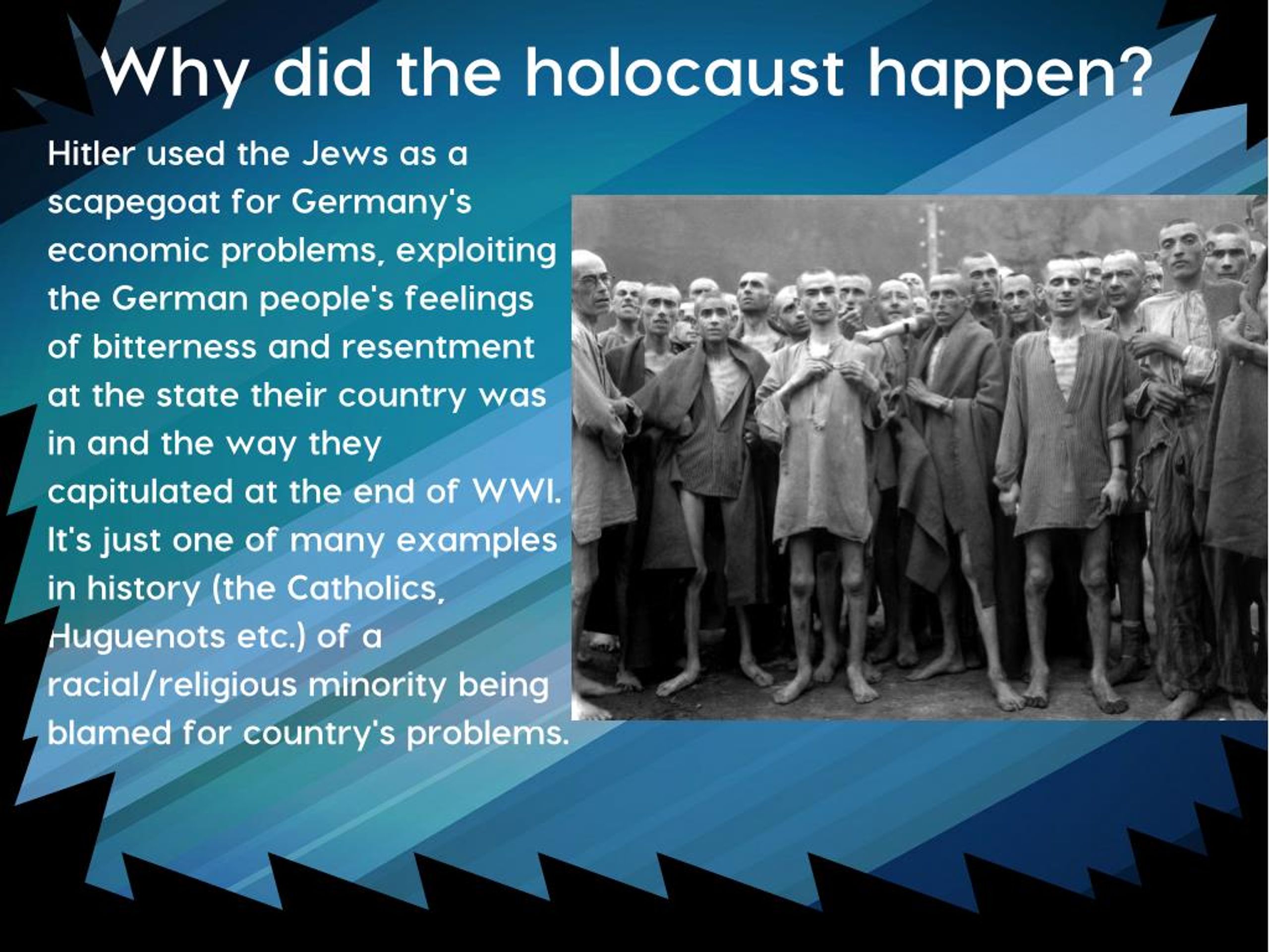 Why did the holocaust happen? Hitler used the Jews as a scapegoat for Germany's economic problems, exploiting the German people's feelings of bitterness and resentment at the state their country was in and the way they capitulated at the end of WWI. It's just one of many examples in history (the Catholics, Huguenots etc.) of a racial/religious minority being blamed for country's problems.