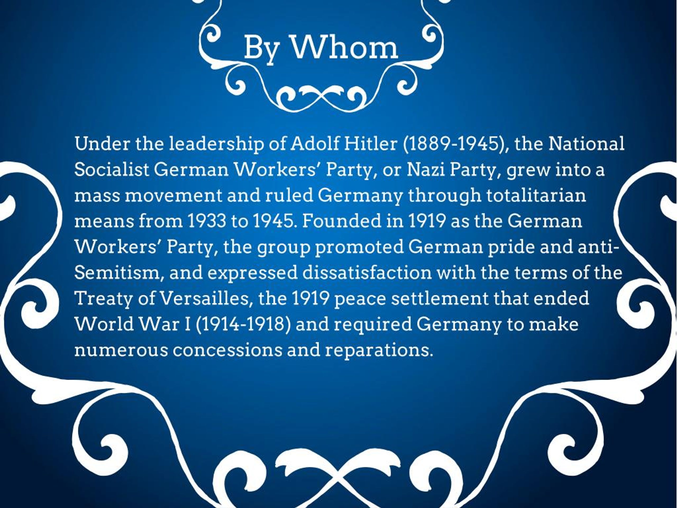 By Whom Under the leadership of Adolf Hitler (1889-1945), the National Socialist German Workers’ Party, or Nazi Party, grew into a mass movement and ruled Germany through totalitarian means from 1933 to 1945. Founded in 1919 as the German Workers’ Party, the group promoted German pride and anti- Semitism, and expressed dissatisfaction with the terms of the Treaty of Versailles, the 1919 peace settlement that ended World War I (1914-1918) and required Germany to make numerous concessions and reparations.