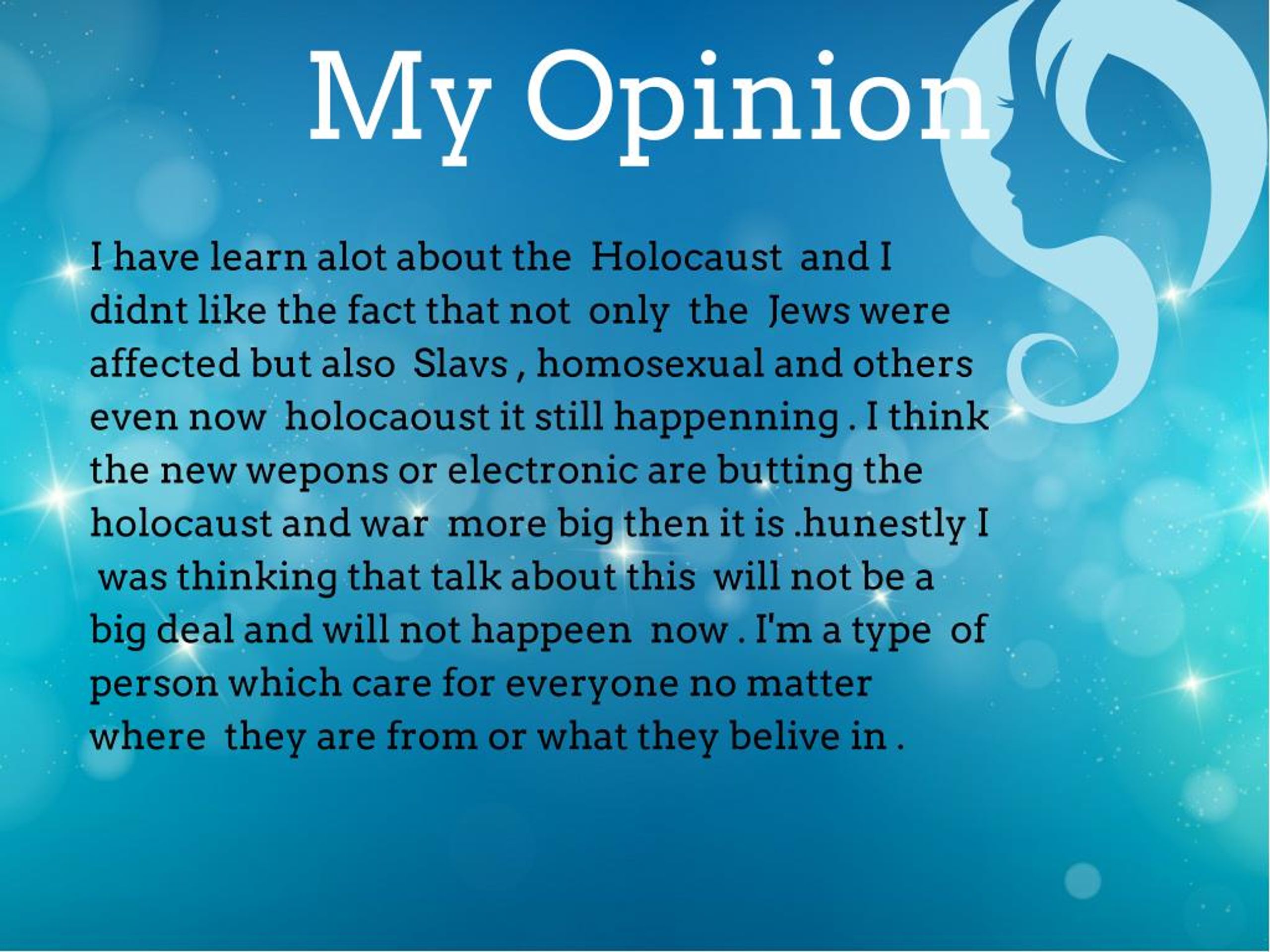 My Opinion I have learn alot about the Holocaust and I didnt like the fact that not only the Jews were affected but also Slavs , homosexual and others even now holocaoust it still happenning . I think the new wepons or electronic are butting the holocaust and war more big then it is .hunestly I was thinking that talk about this will not be a big deal and will not happeen now . I'm a type of person which care for everyone no matter where they are from or what they belive in .