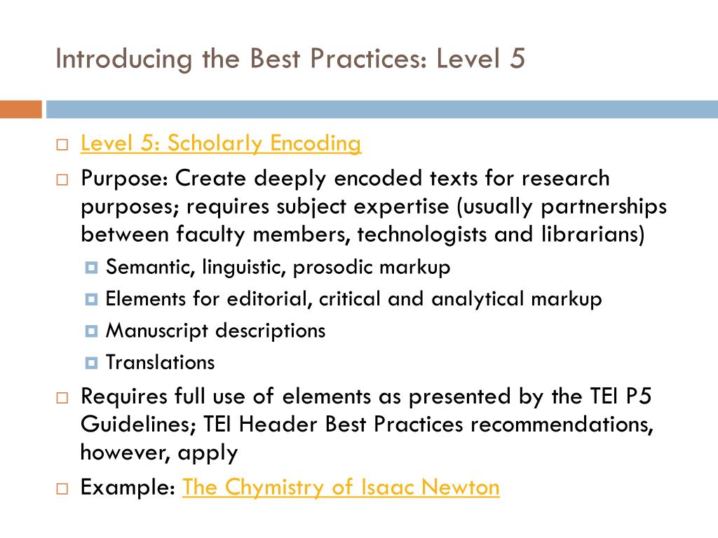 Introducing the Best Practices: Level 5 • Level 5: Scholarly Encoding • Purpose: Create deeply encoded texts for research purposes; requires subject expertise (usually partnerships between faculty members, technologists and librarians) • Semantic, linguistic, prosodic markup • Elements for editorial, critical and analytical markup • Manuscript descriptions • Translations • Requires full use of elements as presented by the TEI P5 Guidelines; TEI Header Best Practices recommendations, however, apply • Example: The Chymistry of Isaac Newton