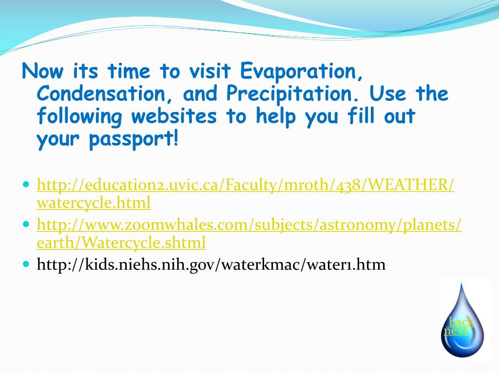 Now its time to visit Evaporation, Condensation, and Precipitation. Use the following websites to help you fill out your passport! • http://education2.uvic.ca/Faculty/mroth/438/WEATHER/watercycle.html • http://www.zoomwhales.com/subjects/astronomy/planets/earth/Watercycle.shtml • http://kids.niehs.nih.gov/waterkmac/water1.htm back next