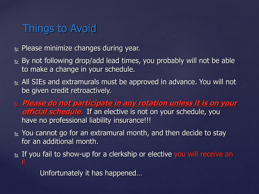 Please minimize changes during year. • By not following drop/add lead times, you probably will not be able to make a change in your schedule. • All SIEs and extramurals must be approved in advance. You will not be given credit retroactively. • Please do not participate in any rotation unless it is on your official schedule.If an elective is not on your schedule, you have no professional liability insurance!!! • You cannot go for an extramural month, and then decide to stay for an additional month. • If you fail to show-up for a clerkship or elective you will receive an F. Unfortunately it has happened… Things to Avoid