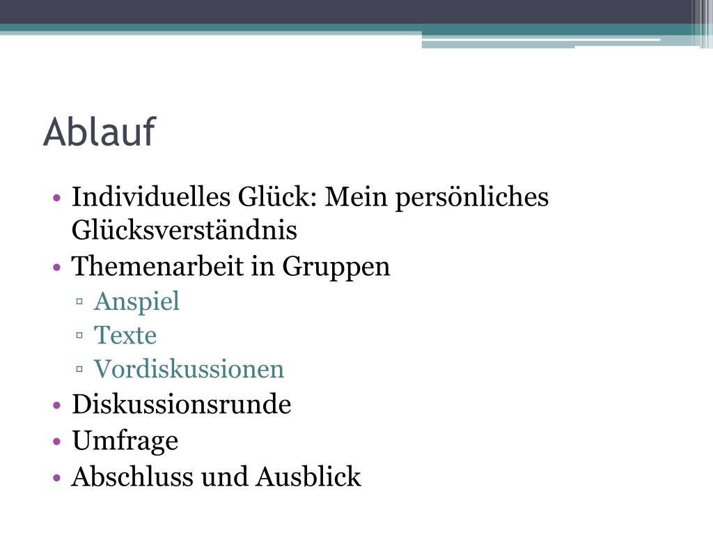 Ablauf • Individuelles Glück: Mein persönliches Glücksverständnis • Themenarbeit in Gruppen • Anspiel • Texte • Vordiskussionen • Diskussionsrunde • Umfrage • Abschluss und Ausblick