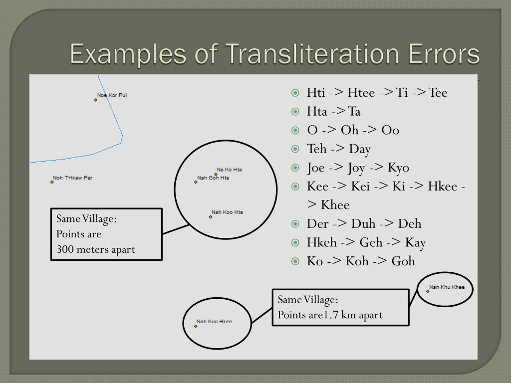 Examples of Transliteration Errors Same Village: Points are 300 meters apart Same Village: Points are1.7 km apart Hti -> Htee -> Ti -> Tee Hta -> Ta O -> Oh -> Oo Teh -> Day Joe -> Joy -> Kyo Kee -> Kei -> Ki -> Hkee -> Khee Der -> Duh -> Deh Hkeh -> Geh -> Kay Ko -> Koh -> Goh