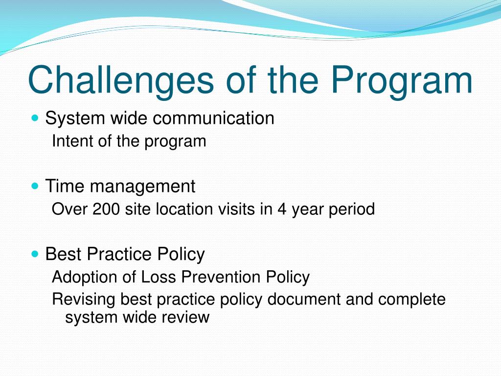 Challenges of the Program • System wide communication Intent of the program • Time management Over 200 site location visits in 4 year period • Best Practice Policy Adoption of Loss Prevention Policy Revising best practice policy document and complete system wide review